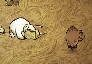 Sleeping is an in-game country that nearly Mobs can enter. Most animals (such every bit Beefalo) sleep during night, while monsters (such equally Spiders) slumber during day. Different Mobs have dissimilar slumber routines, and non all Mobs go to sleep by themselves. Mobs with a home (like Spiders or Pigs) will attempt to return domicile when they need to go to sleep. If left homeless, they will autumn asleep on the spot at the fourth dimension they usually sleep. The actor can put Mobs to sleep by using a Pan Flute or Sleep Sprint, or by eating a Mandrake. The Life Giving Amulet also has the benefit of automatically knocking out nearby mobs upon resurrection. Sleeping Mobs tin can be pushed effectually.